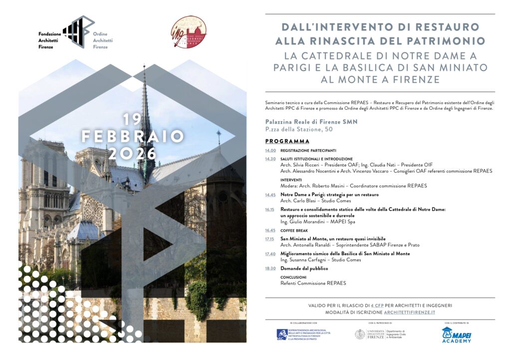 L’evento è un seminario tecnico organizzato dalla commissione “Restauro e recupero del patrimonio esistente” (REpaes) dell’Ordine degli Architetti P.P.C. di Firenze, promosso dall’Ordine degli Architetti P.P.C. di Firenze e dall’Ordine degli Ingegneri di Firenze, con la collaborazione della Soprintendenza Archeologia, Belle Arti e Paesaggio per la città metropolitana di Firenze e la provincia di Prato.